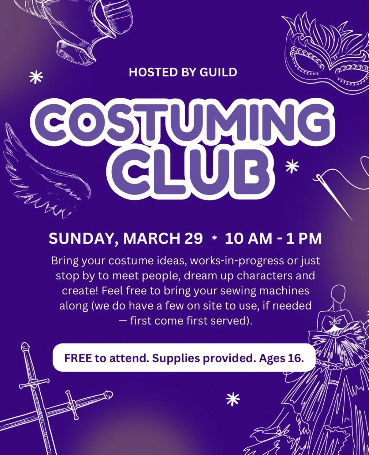 Interested in costume making? Guild is hosting a once a month costume/cosplay meetup where you can bring your costume works-in-progress or just stop by to meet people and share ideas. Guild holds a wide variety of materials and equipment for you to use. And it’s free! No sign up necessary, just stop by! Ages 16+